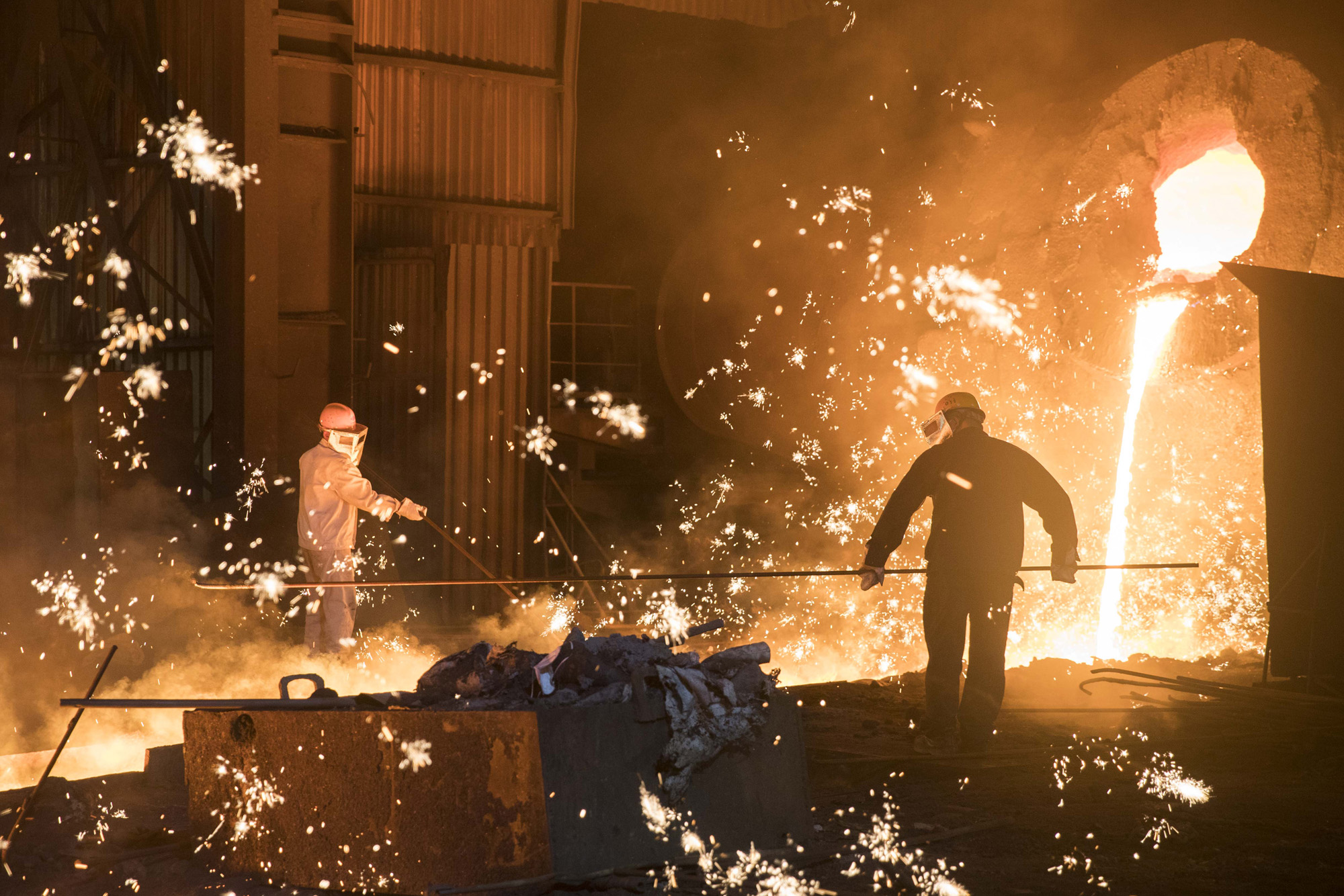 最后一爐鐵水運到鑄鐵機,鑄鐵工進行鑄鐵澆鑄。
