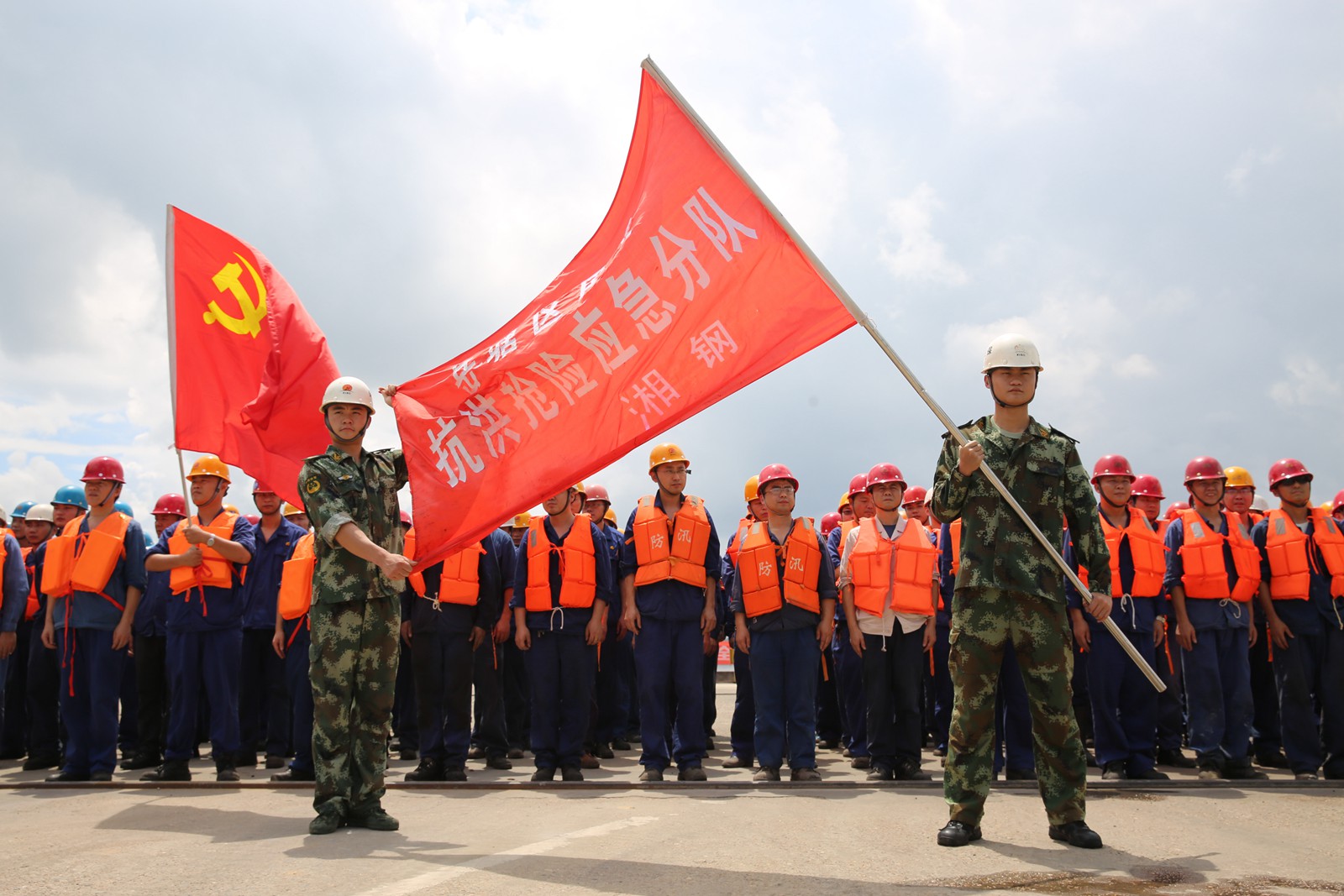 圖為整裝列隊的華菱湘鋼抗洪應急分隊,正準備奔赴抗洪一線。(胡石強 攝)