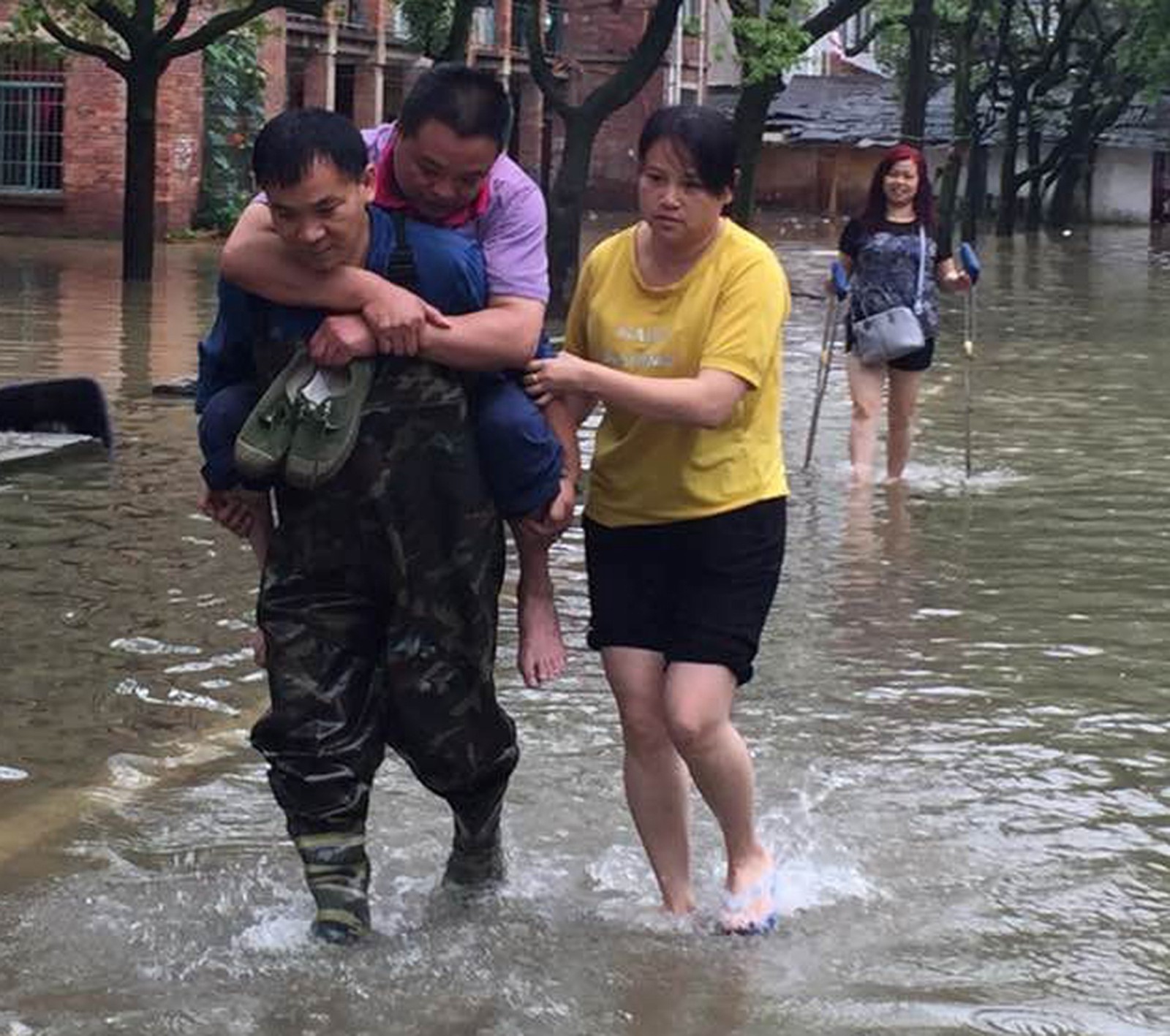 圖為華菱湘鋼商務服務公司救援人員正在轉移行動不便的群眾。(歐陽新根 攝)