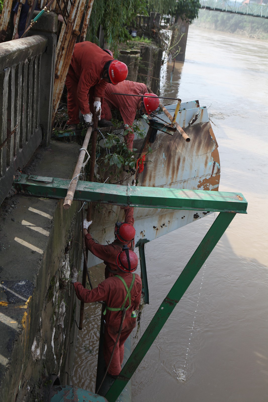 圖為洪峰過后,華菱漣鋼快速組織搶修受損的煤氣管道。(記者 柳琴聲 通訊員 孫遠平 羅興伍 攝)
