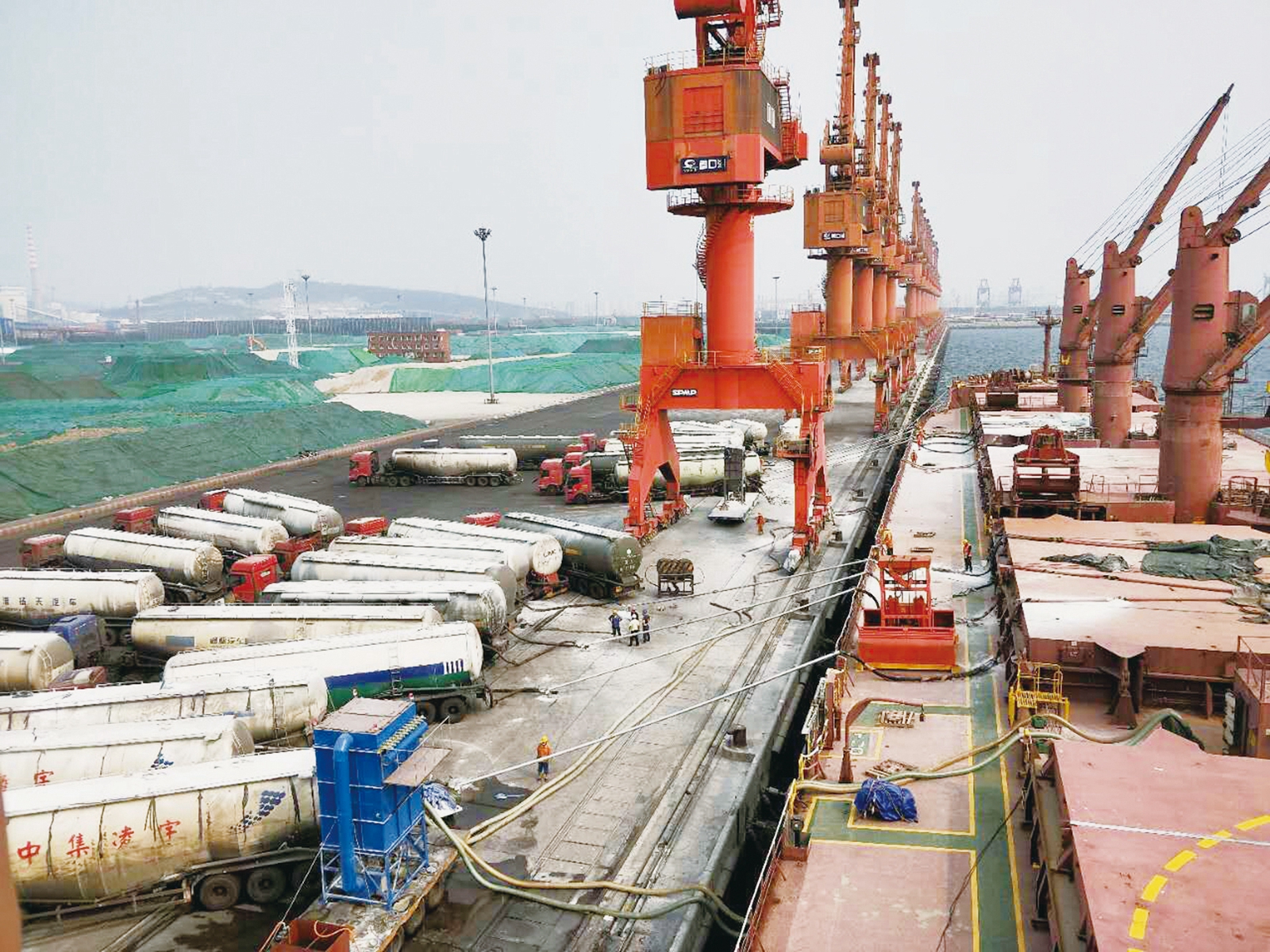 7月3日,1.93萬噸鞍鋼礦渣粉裝船完畢,準備發往美國新奧爾良港。這些礦渣粉最終將用于美國中東部各州的市政工程和基礎建設。近年來,鞍鋼在注重發展鋼鐵主業的同時,高度重視非鋼產業和冶金固廢資源開發利用產業發展,其礦渣粉產品被廣泛應用于國家重點工程項目。圖為鞍鋼礦渣粉在遼寧省營口市鲅魚圈港碼頭裝船時的情景。 (劉金宇 杜蓓 攝)
