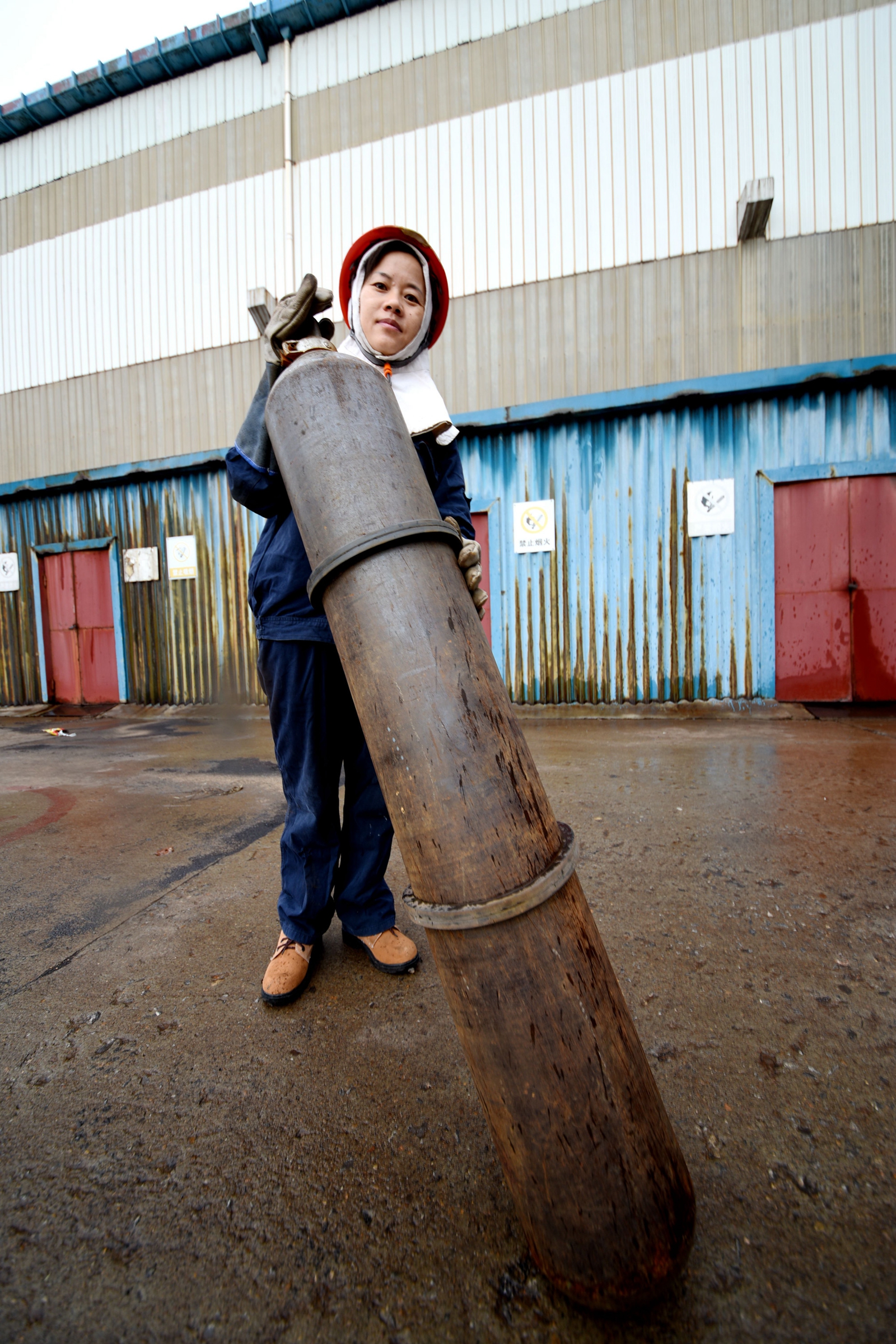 圖三:7時50分,在同事們陸續來到崗位時,藺紅霞已經開始準備作業需要的工具、材料,就連100多斤重的氬弧焊用氣瓶,在她手中也“乖乖”地轉動就位。