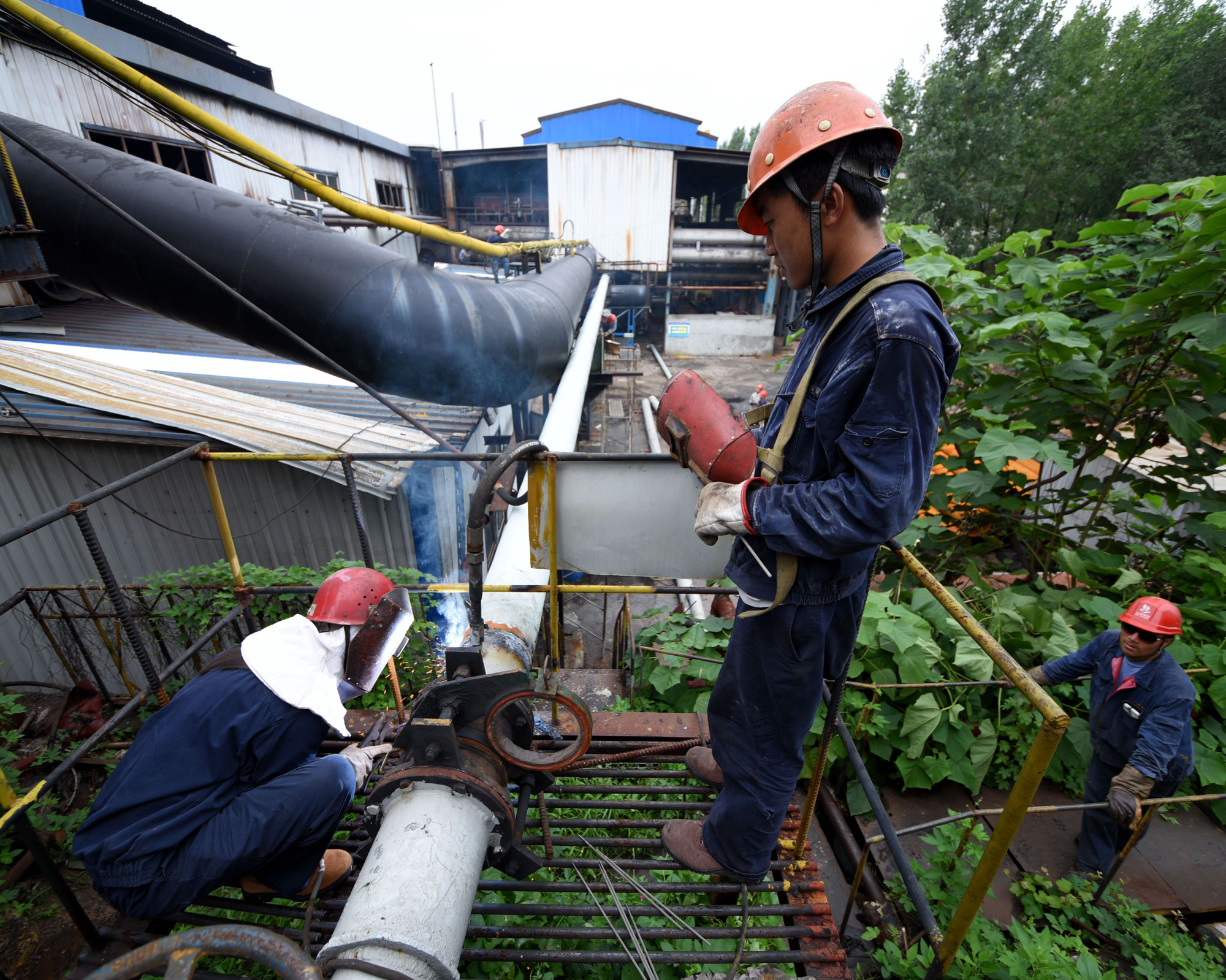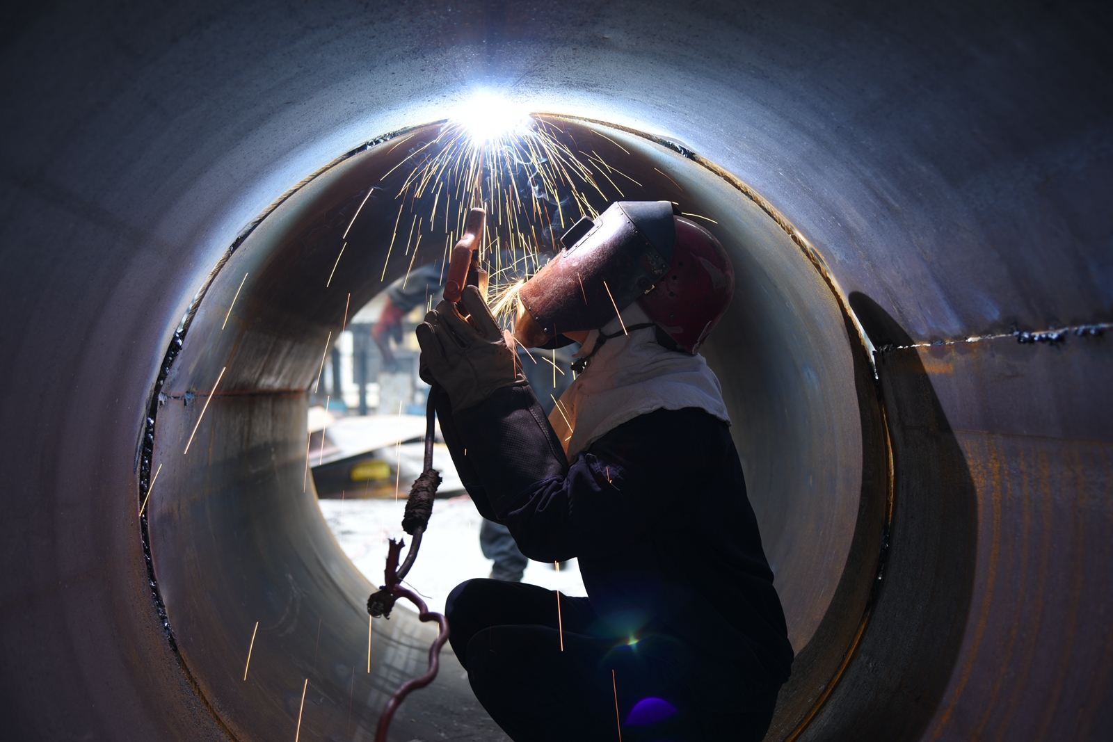 圖四:8時30分,藺紅霞開始焊接制作大型管道構件。因為受作業空間限制,她只有半蹲著焊接。這個作業姿勢持續時間最長的紀錄,是她在第六屆全國鋼鐵行業職業技能競賽中創造的。當時,需要選手連續作業270分鐘,幾乎都保持這樣的姿勢。