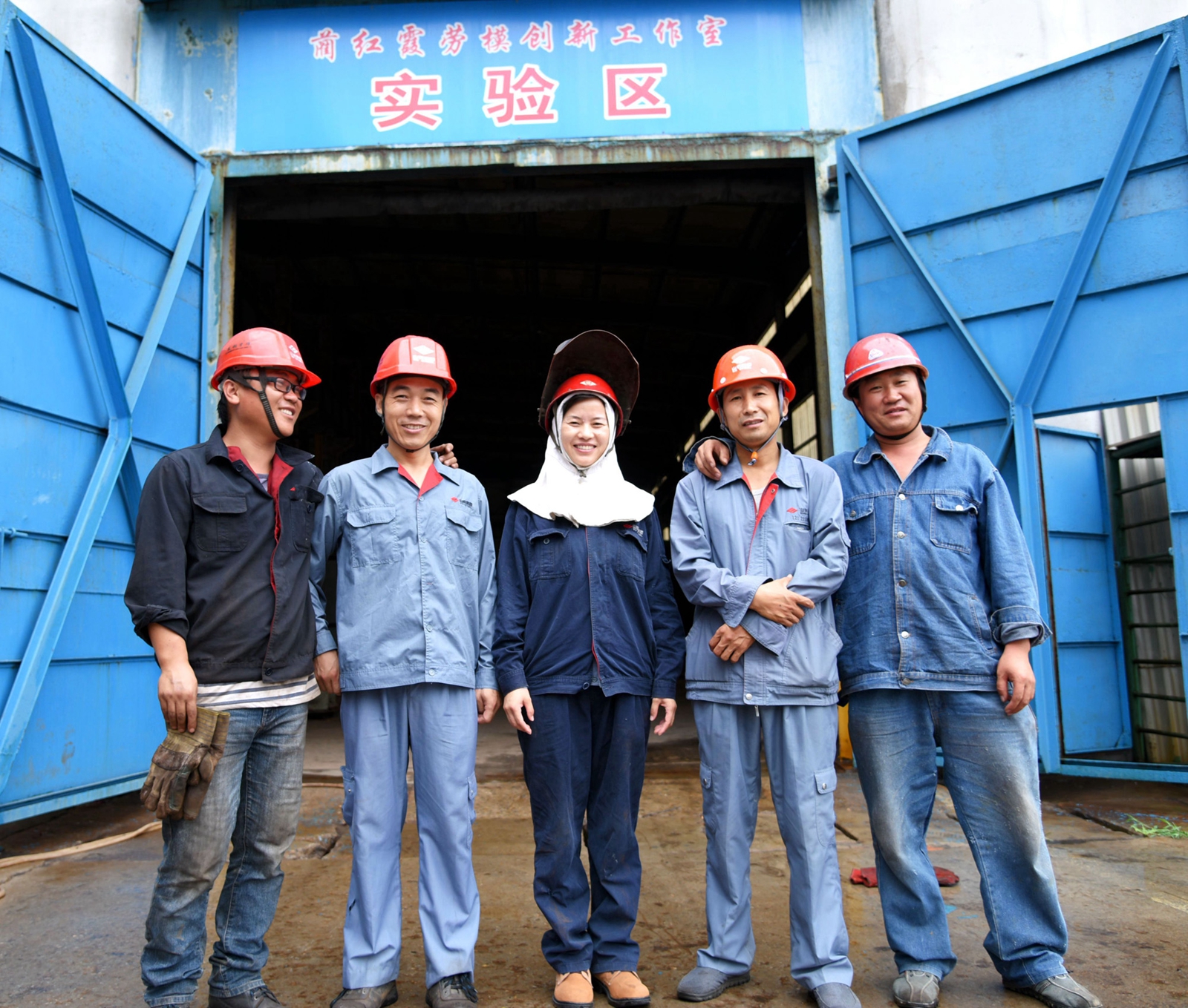 圖六:下午13時30分,藺紅霞和她的勞模創新工作室團隊成員討論工作所遇的問題,這是他們的合照。2013年4月,萊鋼集團建安公司以藺紅霞的名字命名成立了勞模創新工作室。這些年來,該工作室有18項成果獲得國家授權專利。完成技術創新項目30項,創造經濟效益510萬元。