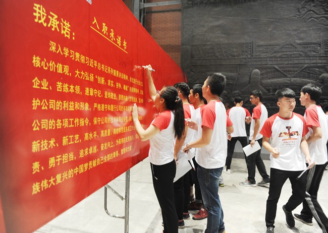 9月1日下午,鞍山鋼鐵舉辦2017年新職工入職儀式。在鞍鋼集團博物館“鋼鐵之魂”浮雕前,227名身著鞍鋼標志文化衫的新職工正式入職,成為鞍鋼這個大家庭中的一員,從這里開始他們職業生涯的第一課。據悉,從2015年起鞍山鋼鐵開始為新入廠職工舉辦入職儀式,每次入職儀式全程影像資料、每人親手簽名的《入職承諾書》,以及每名新職工的照片、全體合影等,都將存入鞍鋼集團博物館,永久收藏。圖為新職工正在《入職承諾書》上簽字。(特約通訊員 張明杰 通訊員 高洋洋 攝)
