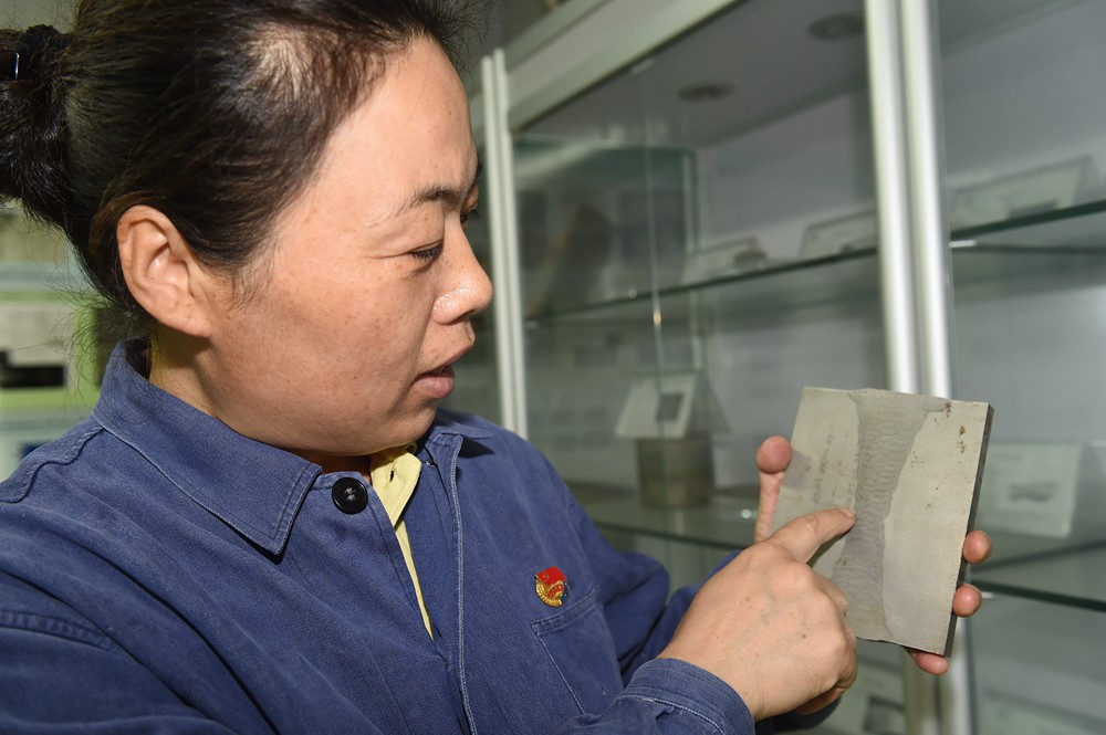 圖一:劉宏正在展示800MPa水電用鋼焊接樣本切面。她憑借自己豐富的現場焊接經驗對國內外一線焊材廠生產的800MPa級電焊條進行工藝性評價,提出了改進方向,最終,首鋼成功開發出適應野外惡劣環境下施工的800MPa級水電鋼配套焊材,達到國際先進水平。