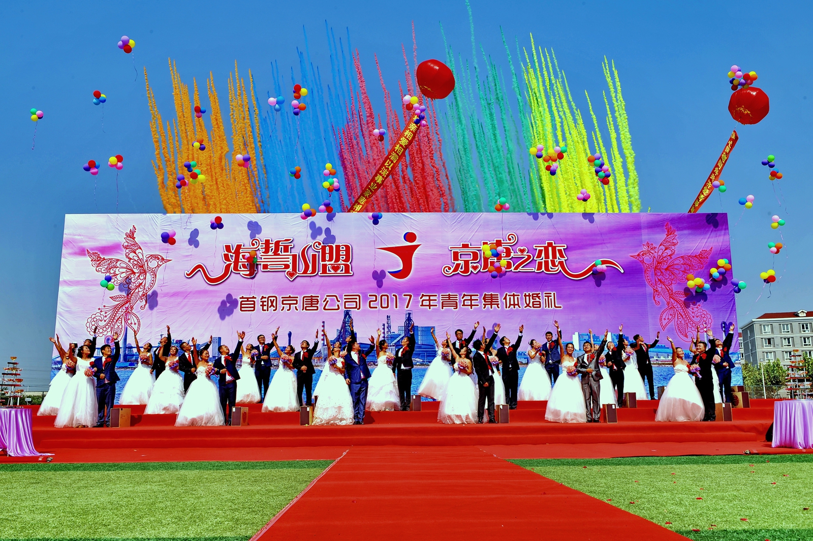 國慶節前夕,首鋼京唐公司舉辦“海誓山盟·京唐之戀”2017年青年集體婚禮,共有21對新人喜結良緣。據了解,該公司每年都舉辦青年集體婚禮,深受職工歡迎。幾年來,已經有287對新人喜結良緣。圖為集體婚禮現場。(特約通訊員 楊立文 攝)