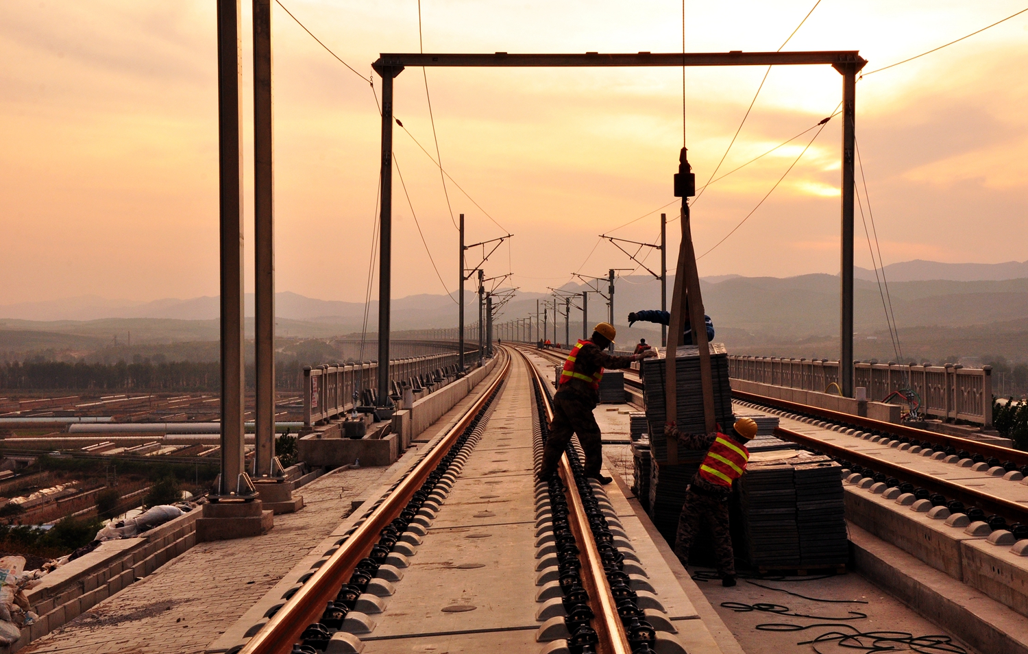9月28日,京沈高鐵遼寧段全線鋪軌在凌源南站完成。據了解,京沈高鐵是國家中長期鐵路規劃“四縱四橫”高速鐵路網的收官大作,全長698公里,采用鞍鋼高速重軌鋪設。鋪軌采用現場焊接的方式,將出廠長度為每根500米的重軌焊接為一根鋼軌,連沈陽和北京,同時保證列車高速行駛的安全、平穩。圖為工人們正在京沈高鐵遼寧段上吊運通信電纜溝蓋板。(柳祖林 攝)