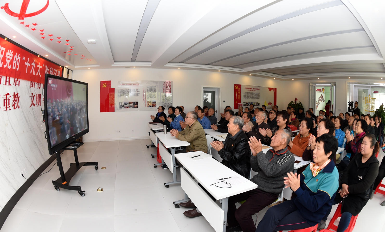 10月18日上午,太鋼老齡委協同錦繡苑社區組織老勞模、老干部及離退休職工收聽收看黨的十九大開幕會直播,喜迎黨的十九大勝利召開。圖為收看直播現場。(特約通訊員 王旭宏 攝)