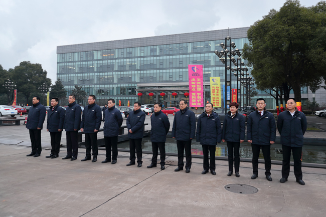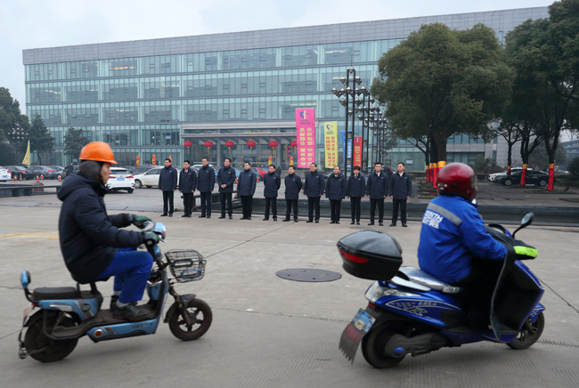 早上7點半,中天鋼鐵集團大門口鞭炮齊鳴,一片喜氣洋洋。該集團董事局主席、總裁、黨委書記董才平攜集團高層著裝整齊的列隊站在集團門口迎接上班的員工們,給員工們送上最誠摯的問候和新年的祝福,這項傳統已經延續了21年。( 陳明 攝)