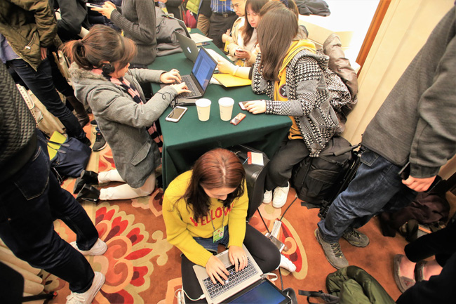 后排的記者席地而坐,在有限的空間下進行會議報道。
