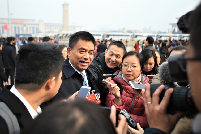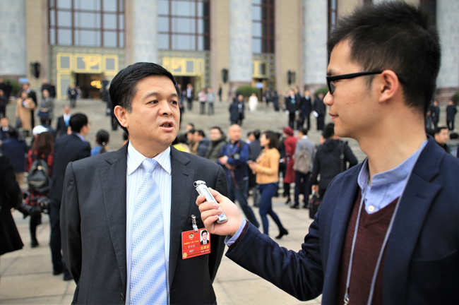 劉永好委員在步入會場前正在接受媒體采訪。