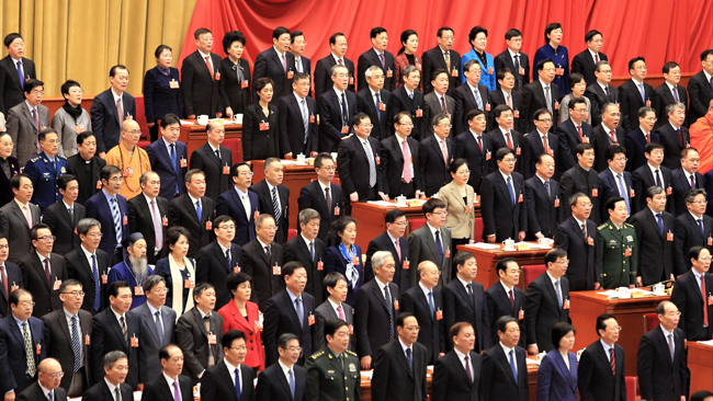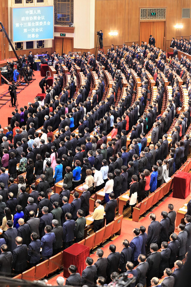 3月15日上午,全國政協十三屆一次會議在人民大會堂舉行閉幕會。圖為委員們起立高唱國歌。
