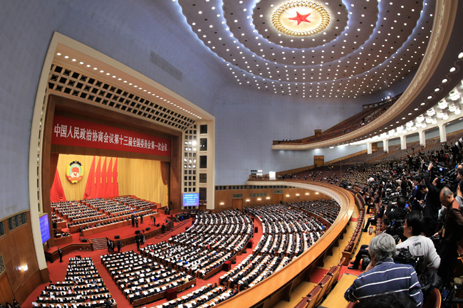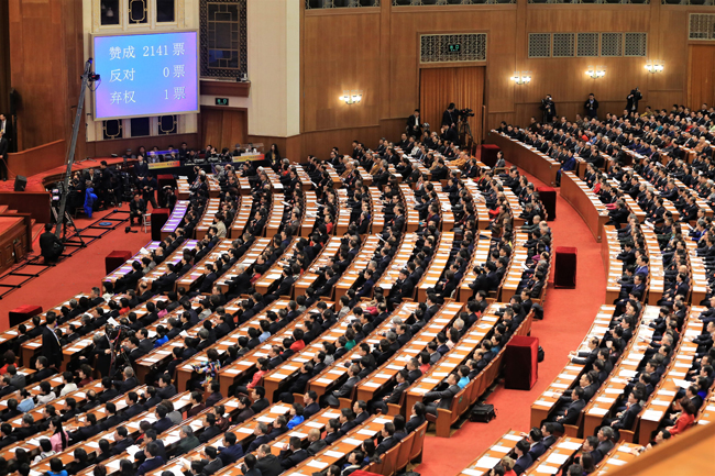 贊成2141票、反對0票、棄權1票,通過政協第十三屆全國委員會第一次會議關于常務委員會工作報告的決議。 (本報兩會報道組記者 顧學超 攝)