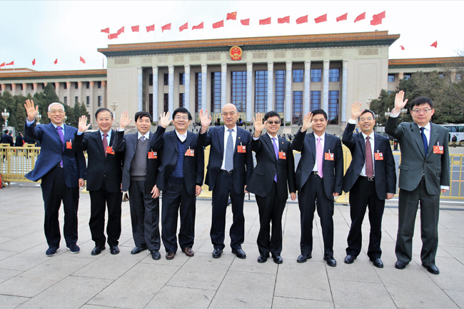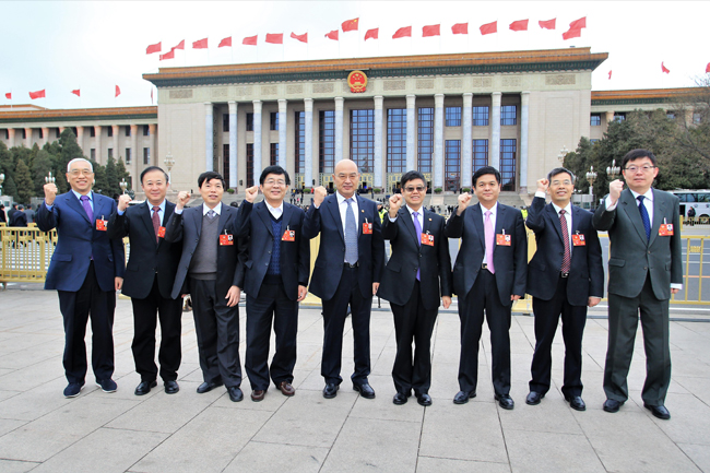 圖為閉幕會開始前,來自鋼鐵冶金及相關行業的委員們(從左至右依次為:唐復平、趙繼、孫朝暉、高峰、何文波、劉明忠、李利劍、謝建新、李衛)在 人民大會堂前合影留念。 (本報兩會報道組記者 顧學超 攝)