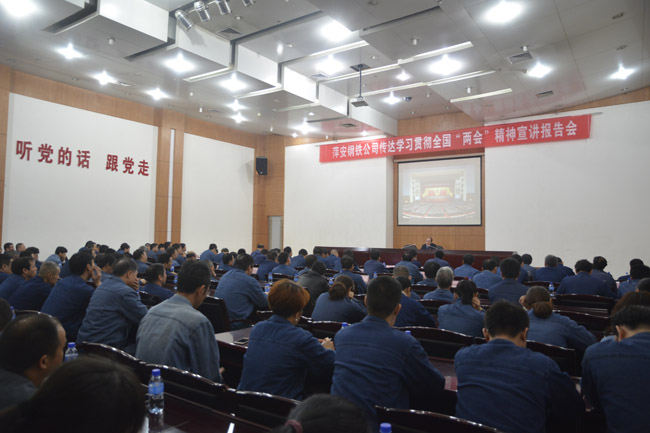 3月24日星期六,方大集團萍安鋼鐵公司會展中心第二會議室內座無虛席,該公司全體中、高層管理人員和部分生產經營骨干共140余人,聚精會神傾聽十三屆全國人大代表溫菲對全國兩會精神的宣講。萍安鋼公司干部職工紛紛表示,要以全國兩會精神為引領,聽黨的話,跟黨走,不忘初心,扎實工作,為實現中國夢作出新貢獻。(周強 厲躍萍 攝)