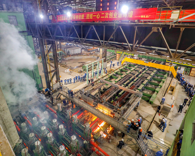 12月20日下午3時08分,隨著引錠桿緩緩拉出重型H型異形連鑄坯,標志著馬鋼重型H型鋼異型坯連鑄機熱負荷試車圓滿成功,第一根國產重型H型連鑄坯在馬鋼誕生。據悉,馬鋼重型H型鋼產線是我國第一條熱軋重型H型鋼生產線,設計年產量79萬噸,產品主打目前國內所缺的重型系列、厚壁系列、寬翼緣系列等高附加值H型鋼產品。圖為熱負荷試車現場。(張泓 李忠好 攝)