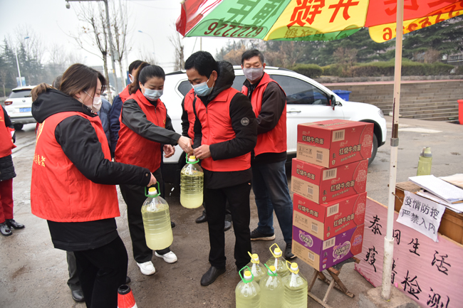 2月21日,泰山鋼鐵集團部分黨員和青年志愿者自發捐款購買了方便面、火腿腸、酒精等用品,來到同心家園,安泰華府、泰鋼家屬院等小區,看望慰問疫情期間堅守崗位的志愿者及小區物業執勤人員,對他們疫情期間辛勤付出表示慰問。圖為慰問現場。(特約通訊員 鄭亮友 攝)