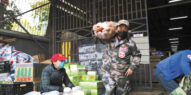 在武漢市新冠肺炎疫情防控的關鍵時刻,中國寶武武鋼集團組建了17支工作隊下沉社區,配合當地政府開展疫情防控工作。目前,來自工作隊的1753名黨員干部到社區報到,其中892人已到崗參與志愿者行動。圖為3月7日,武漢市青青教育管理公司副總經理孫勁,在武漢中百倉儲南湖購物廣場參加“十元愛心菜”分揀、打包志愿服務。 (李可心 攝)