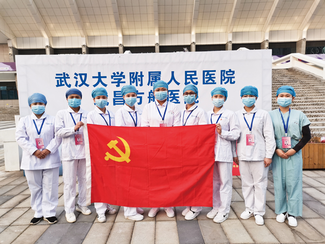 3月5日,廣西第二批馳援湖北醫療隊護理分隊入黨宣誓儀式在武昌方艙醫院舉行。柳鋼醫院首批援鄂醫療隊的9名非黨員隊員光榮入黨。圖為她們宣誓后合影留念。(潘陶玲 攝)