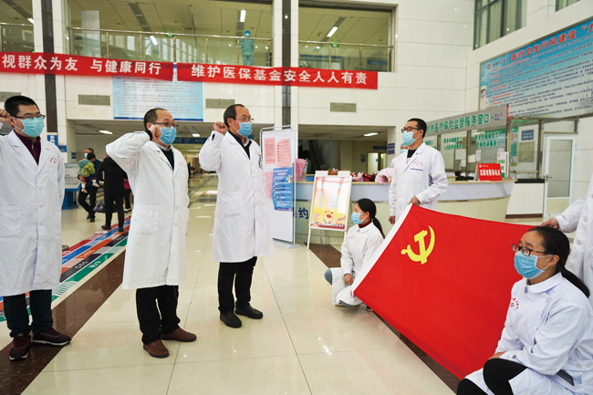 3月12日,中國寶武華潤武鋼總醫院火線入黨宣誓儀式在湖北省武漢市青山區華潤武鋼總醫院門診廣場舉行(如圖)。該總醫院3名抗疫一線人員光榮入黨,成為中共預備黨員。(王媛媛 攝)