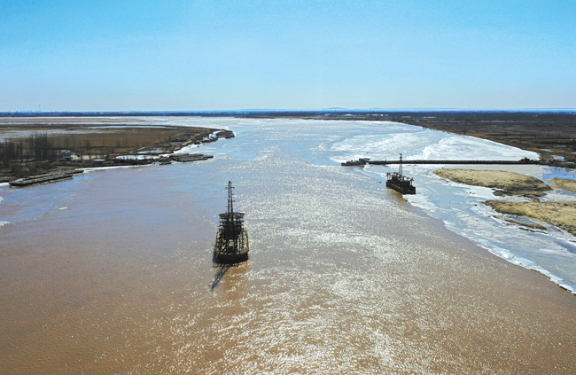 3月13日8時,黃河內蒙古包頭昭君墳包鋼取水口段平穩開河。連日來,包鋼防凌隊伍積極配合爆破組,完成包鋼1號取水口部分河段破冰任務,及時排除險情,保證安全取水,確保包鋼水源地河段順利度過凌汛期。圖為包鋼2號、3號取水口處黃河已平穩開河。 (記者白立新 通訊員王明輝 攝)