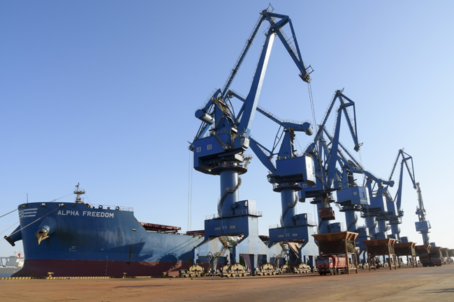 面向復工復產企業,天津港自2月25日起開通免費“海上穿梭巴士”“天天班”服務。從3月1日至6月30日,免收進出口貨物港口建設費,并將貨物港務費、港口設施保安費等定價收費標準降低20%。3月19日,該港開通“天津~胡志明”集裝箱班輪新航線。至此,天津港集裝箱航線達到130條,復工復產率達100%。圖為正在作業的礦石碼頭。(本報記者 蔡立軍 通訊員 薛力強 攝)