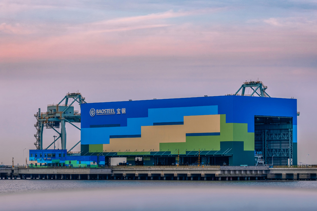 4月15日,在位于上海市寶山區北部長江口水道南岸的寶鋼全天候碼頭上,中國寶武寶鋼股份裝卸船正在鋼結構船庫里作業(如圖)。