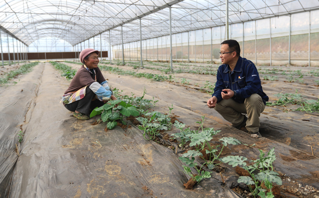 4月10日,貴州省盤州市劉官街道瞿家莊村果蔬大棚內,新栽種的西瓜苗長勢良好,這是鞍鋼集團攀鋼在對口扶貧村開展產業扶貧的又一新舉措。截至目前,攀鋼在瞿家莊村援建標準化果蔬鋼架大棚8000平方米,惠及868戶2868人,其中貧困人口160戶558人。圖為攀鋼扶貧干部何凱(右)在果蔬大棚里向村民了解西瓜生長情況。(記者 孟祥林 文 通訊員 何仁江 攝)