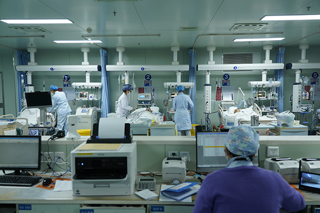 連日來,新鋼中心醫院根據疫情形勢的變化,全力做好醫療資源統籌調配,集中設立隔離過渡病房,擴容重癥監護床位,各科室醫護力量接受醫院統一調配,優先保證發熱門診、急診、呼吸與危重癥醫學科、重癥醫學科及各個呼吸道疾病收治病區的人力,全力應對新冠重癥患者就診高峰期。目前,該院危重癥醫學科有患者12人,2022年12月份,共有40余名危重患者通過救治轉入普通病房。圖為該院重癥醫學科病區內醫護人員有序救治患者。(特約通訊員 歐陽斯娟 攝)