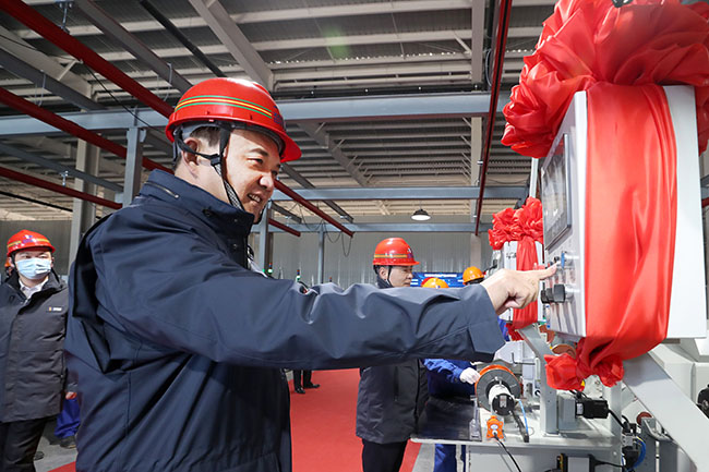 1月10日,隨著中天鋼鐵集團董事局主席、總裁、黨委書記董才平的正式宣布,中天淮安項目一廠首盤成品成功下線。圖為董才平親手按下簾線機啟動鍵,并為機臺命名、注冊了第一件簾線成品盤。( 劉志鈞 攝)